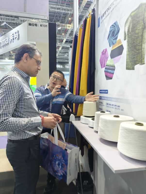 At the booth, a rich product matrix is quietly laid out—from highly elastic sports fibers to soft and skin-friendly home fibers, and sustainable products that integrate functionality and environmental concepts. Behind each exhibit is a deep response to segmented scenarios. Among them, the “Dizente” brand elastic bamboo-slub controlled PET/PTT composite fiber undoubtedly stands as the “technical backbone” of the booth. It breaks the traditional single expression of elastic fibers and injects a rhythmic sense of tension and relaxation into the fabric with a controllable bamboo-slub structure.